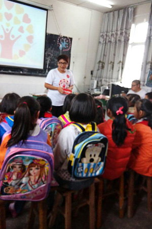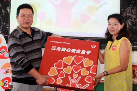 三生(中国)四川分公司外事经理赖敏为孩子们带去“三生爱心安全盒子”