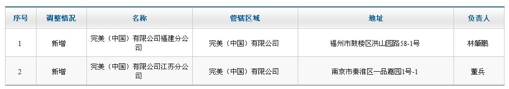 完美(中国)有限公司调整的省级分支机构