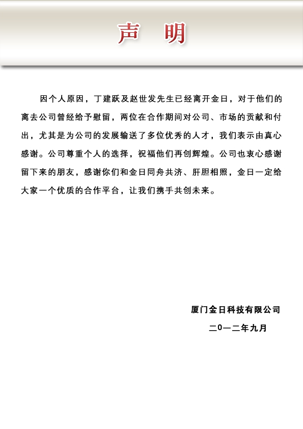 厦门金日科技有限公司近日官方发表声明,证实丁建跃、赵世发两人已离开金日。声明全文如下: