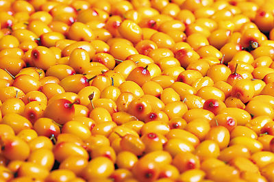 沙棘含有100多种l珍贵的天然化合物,有“维生素之王”、“水果之王”、“营养之王”的美称。维生素A、B1、Bb、C、E、K、P、胡萝卜素含量相当高,含有20多种氨基酸,20多种微量元素,维生素C的含量,是猕猴桃的2-3倍,甜蜜桔的100倍,鲜蜂蜜的20倍,苹果的100倍,西红柿\的80倍。另含有玻璃酸、柠檬酸、苹果酸、乙酸、酒石酸、草酸、亚油酸、脂肪酸、蛋白质、碳水化合物、植物醇等,锶、钇、铝、钙、磷、铍、镍、`钛、锌、硅、锡、铬、锰、锆、镁、硒等无机微量元素。