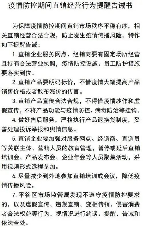 近期北京市新增新冠肺炎确诊病例中,有多人在外省参加某公司培训。平谷区市场监管局迅速行动,深入排查检查辖区直销市场,严管严控线下直销业务培训、直销会议等人员密集活动。