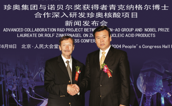 2004年,珍奥双迪事业创办人陈玉松先生(右一)与诺贝尔生理学及医学奖得主青克纳格尔博士(左一)在人民大会堂就核酸项目研发达成合作意向并成功签约。这种结缘,不仅开启了中国企业家与诺奖得主合作的先河,更让珍奥双迪人目睹了世界顶级科学家的风范,接受到了世界科技最前沿资讯。