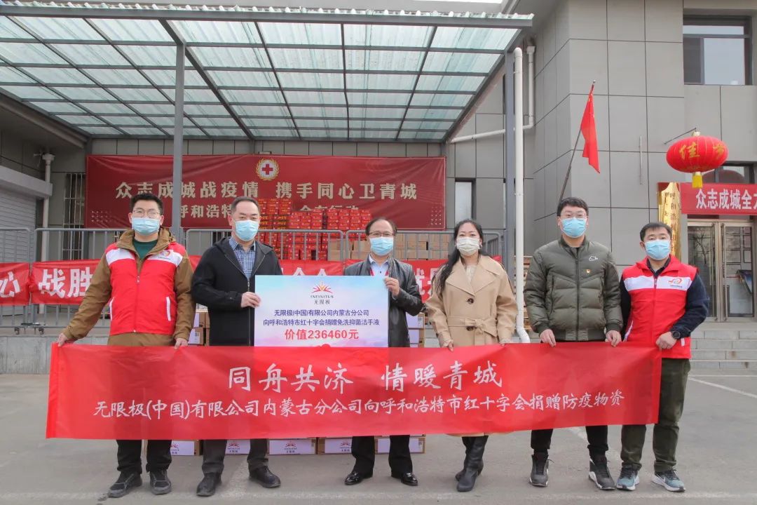 3月11日,无限极内蒙古分公司联合新浪内蒙古及党支部,向呼和浩特市红十字会捐赠“无限极免洗抑菌洁手液”15764瓶,价值236460元。