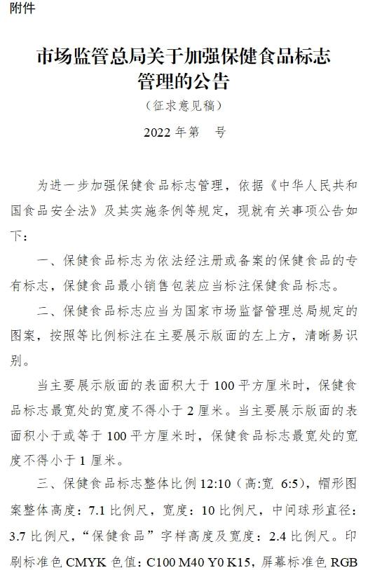 3月21日,市场监管总局发布了《市场监管总局关于加强保健食品标志管理的公告(征求意见稿)》(以下简称“征求意见稿”),向社会公开征求意见。