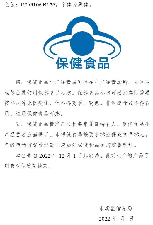 征求意见稿还对保健食品标志即“蓝帽”的规制进行了申明。保健食品生产经营者可以在生产经营场所、专区专柜等位置使用保健食品标志。保健食品标志可根据实际需要按样式等比例变化,但不得变形、变色。非保健食品不得冒用、盗用保健食品标志。
