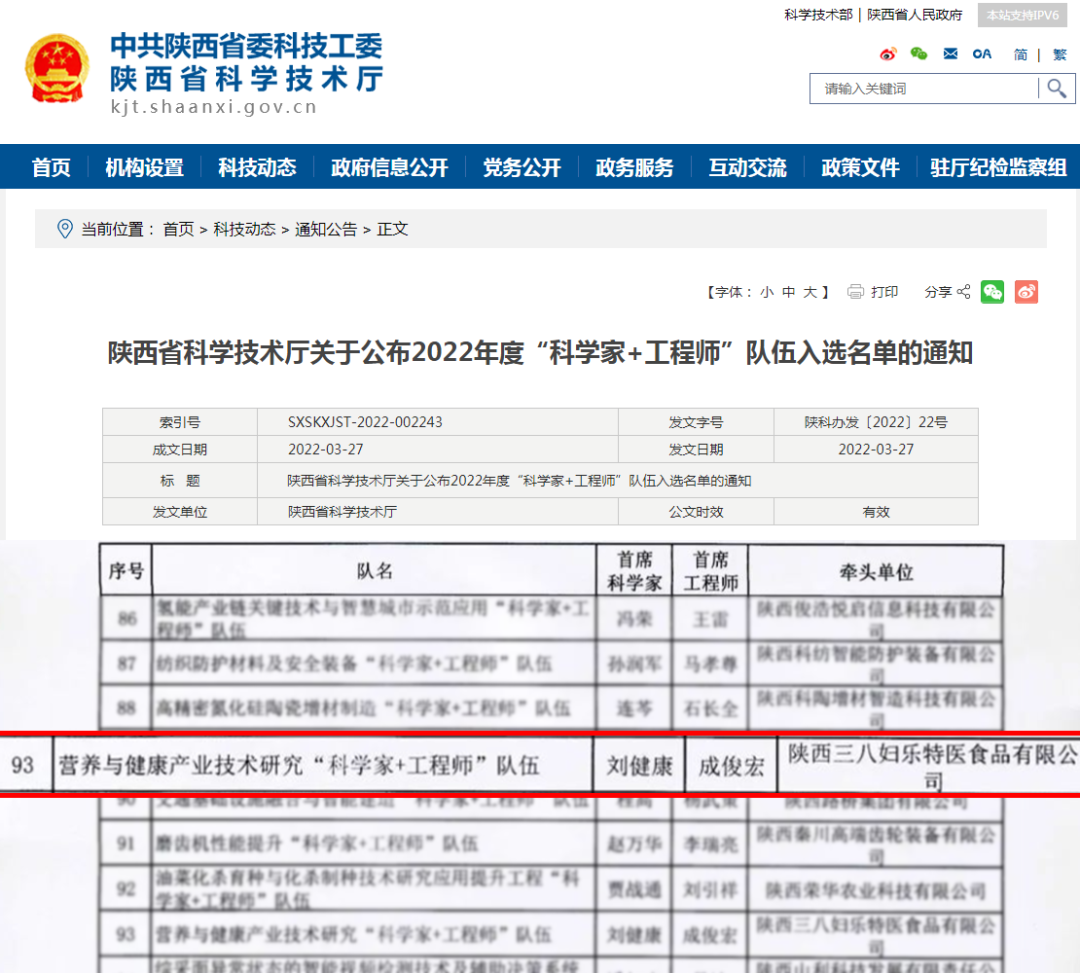 3月28日,陕西省科学技术厅发布了“关于公布2022年度‘科学家+工程师’‘队伍入选名单”的通知,陕西三八妇乐科技集团营养与健康产业技术研究“科学家+工程师”队伍成功入选。项目首席科学家为西安交通大学生命科学与技术学院院长、西安交通大学-三八妇乐生物医药联合研究院院长刘健康,首席工程师为陕西三八妇乐科技集团研发中心总监成俊宏。