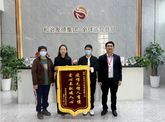 近日,天津东丽华明街第五社区党群服务中心书记高志勇、副书记王春玉专程来到和治友德公司全球运营总部,对和治友德长期以来对社区各项工作的帮助以及抗击新冠疫情的支持表达真挚感谢,并赠送“疫情无情人有情,爱心奉献暖人心”的锦旗。和治友德副总裁郅群女士代表公司接受锦旗。