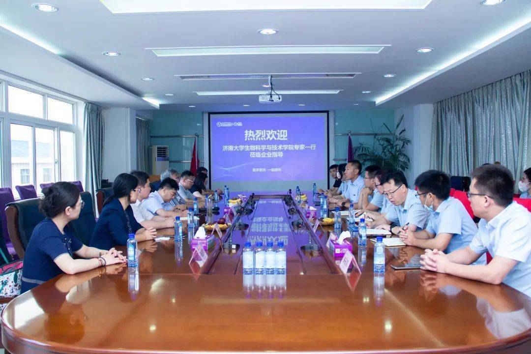 7月12日, 济南大学生物科学与技术学院名誉院长徐会连、济南大学生物科学与技术学院党委书记孙翔玲一行9人莅临威海紫光公司进行参观指导。威海紫光经理李森、威海紫光特医特膳部长邓淑玲、威海紫光研发中心部长王文风等相关领导参加座谈会,山东文旅舜骋文化产业有限公司副总经理吴寒冰作为特邀嘉宾出席交流活动。