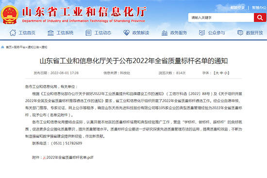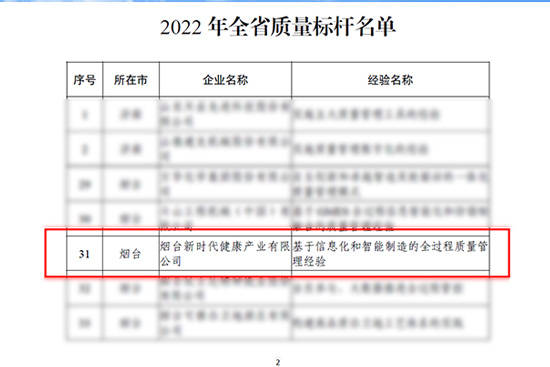 2022年8月1日,山东省工业和信息化厅公布了2022年质量标杆企业名单,烟台新时代健康产业有限公司(以下简称:烟台健康公司)凭借“基于信息化和智能制造的全过程质量管理经验”获得山东省质量标杆的称号。