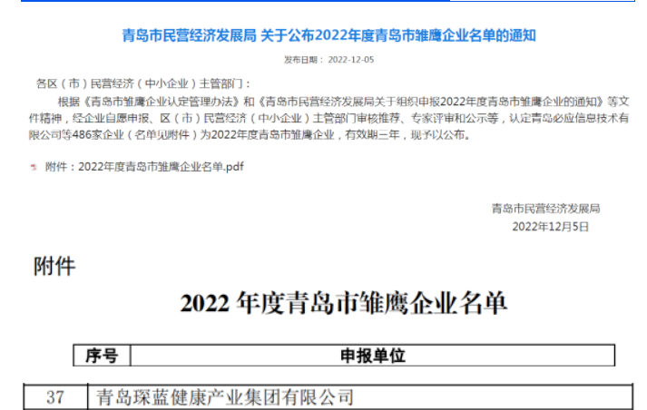 为激发中小企业创新创业动力,树好导向,立起标杆,带动更多中小企业高质量发展,在由青岛市民营企业发展局、青岛市中小企业局发起的“2022年度青岛市雏鹰企业认定”活动中,经过自愿申报、区市推荐、专家评估等程序,康尔生物集团公司(琛蓝健康)凭借研发创新能力及良好的市场发展潜力,从众多参选名单中脱颖而出,被认定为“2022年青岛市雏鹰企业”。