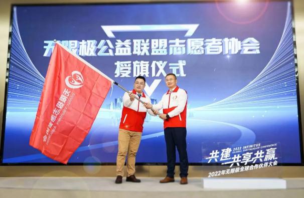 大会上,无限极志愿者协会与公益联盟志愿者分会的授旗仪式顺利举行,无限极公益联盟志愿者协会将作为无限极与各位合作伙伴联合公益的重要纽带及平台。公益联盟志愿者分会会长陈展超先生向全体供应商伙伴发出倡议,希望他们加入无限极公益联盟志愿者协会,和无限极一起履行社会责任,推动公益事业高质量发展。