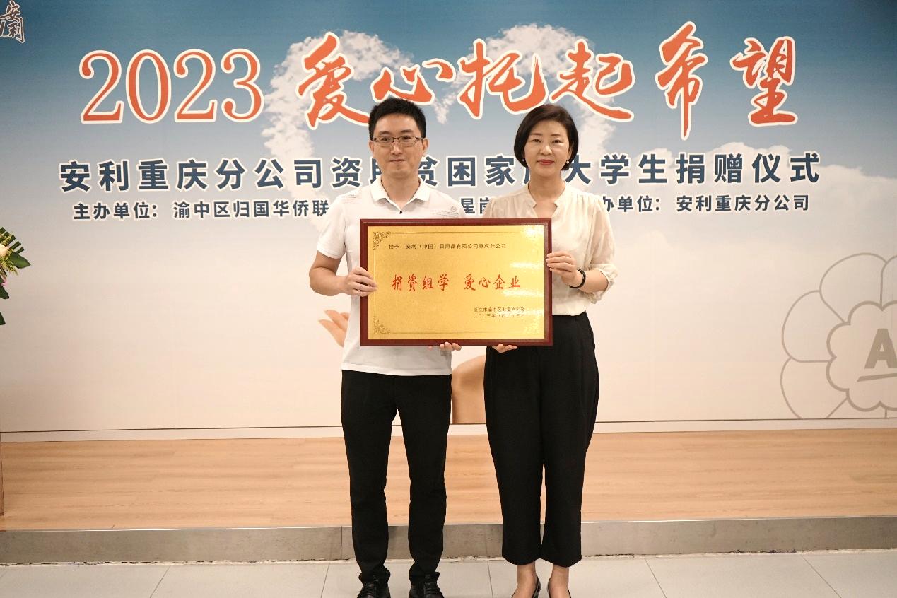 捐赠仪式中,安利重庆分公司向渝中区七星岗街道10名贫困家庭的优秀学子,捐赠了3万元爱心助学金。