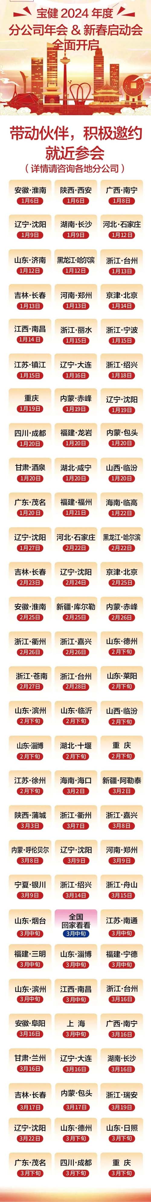 宝健2024年度分公司年会&新春启动会已全面开启 联合造势、互动借力! 积极邀约,就近参会! 2024新征途,赢战开门红!