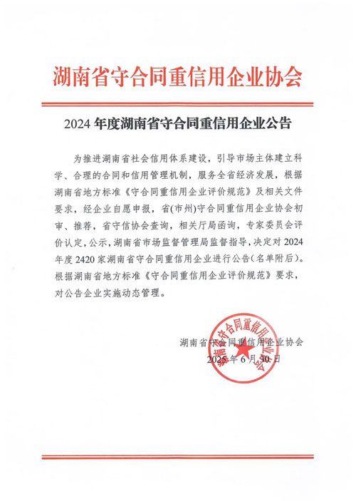 为推进社会信用体系建设,引导市场主体健全合同信用管理机制,服务省市经济发展,湖南省及长沙市守合同重信用企业协会每年开展“守合同重信用”企业公示活动,表彰企业在合同管理、履约能力及社会信誉等方面的突出表现。依据《湖南省守合同重信用企业评价规范》等要求,经企业申报、协会初审推荐、信用核查、部门函询、专家评审及公示等严格程序,最终评选出获誉企业。
